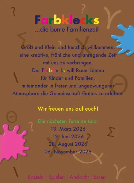 Beim Farbklecks sind Groß und Klein herzlich willkommen, eine kreative, fröhliche und anregende Zeit als Familien zu verbringen, also z.B. Kinder mit Eltern, Großeltern, Patentanten ...